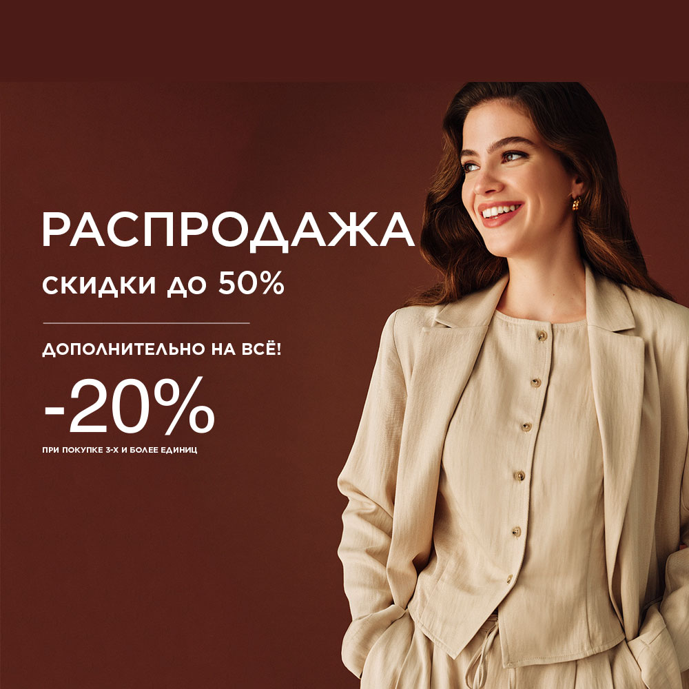 Распродажа до 50% и дополнительная скидкаГотовы к самому выгодному предложению сезона? Распродажа в самом разгаре! Скидки до 50%, а также при покупке от 3-х вещей вы дополнительно получаете скидку 20%. Это идеальный момент, чтобы купить всё и собрать стильный комплект!Адреса магазинов